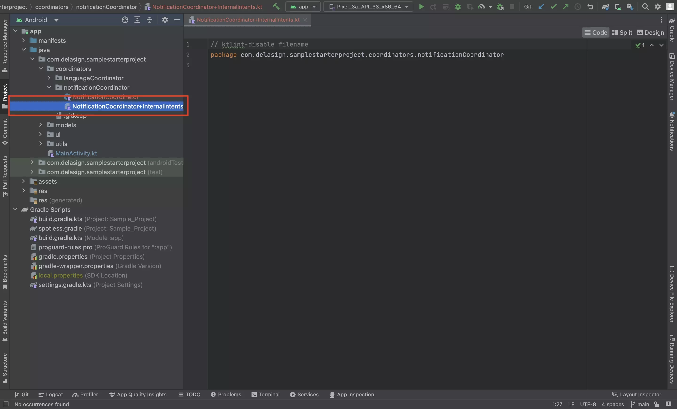 In the package created in Step One, create a new Kotlin file called NotificationCoordinator+InternalIntents.kt and leave it blank for now.