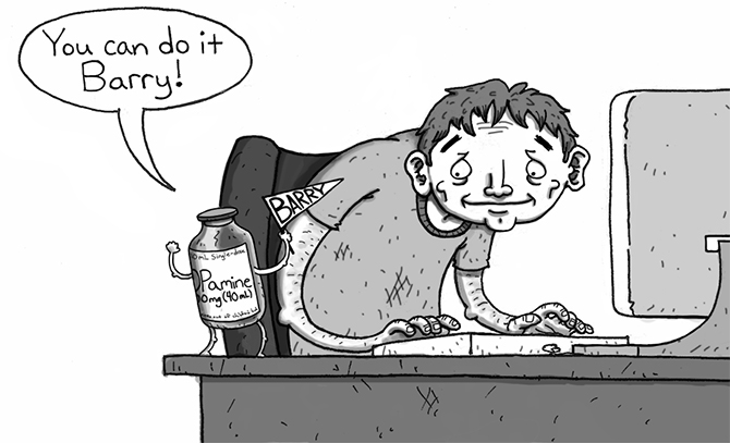 A cartoon illustrating a bottle of dopamine cheering on a human called Barry.