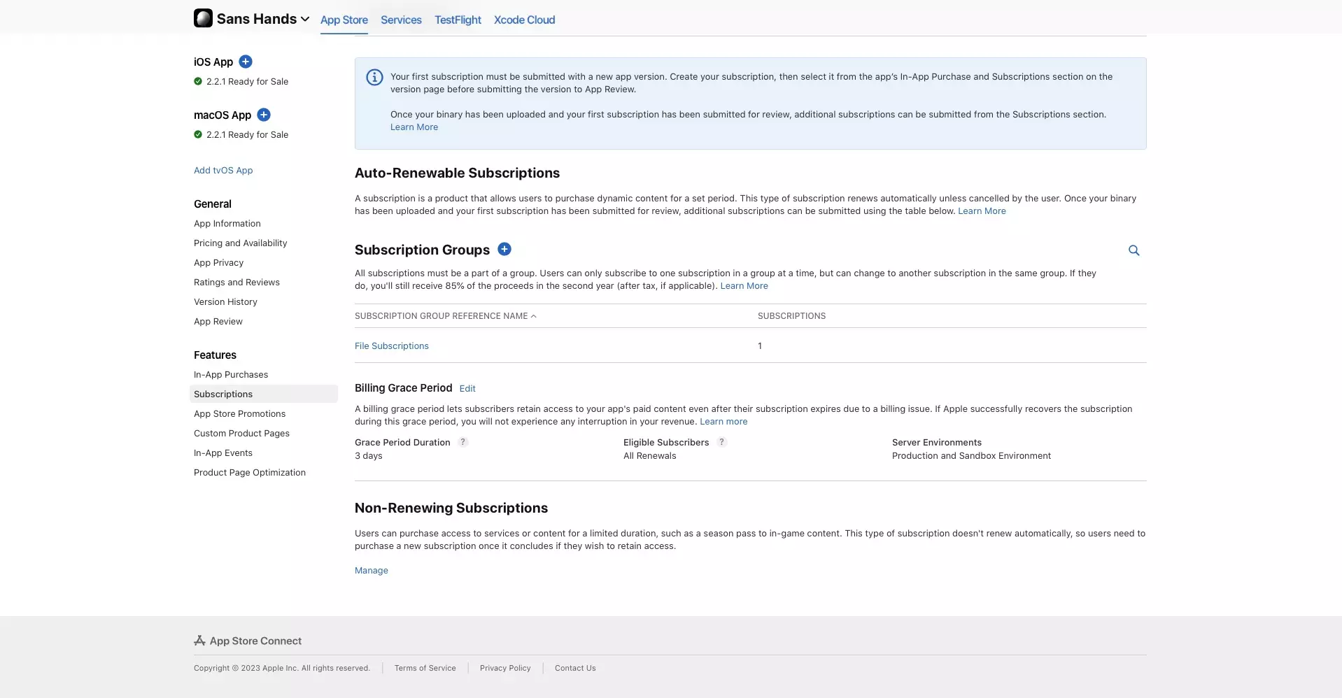 A step by step guide on changing or turning off the subscription grace period for iOS, iPadOS, MacOS, WatchOS or TVOS using App Store Connect.