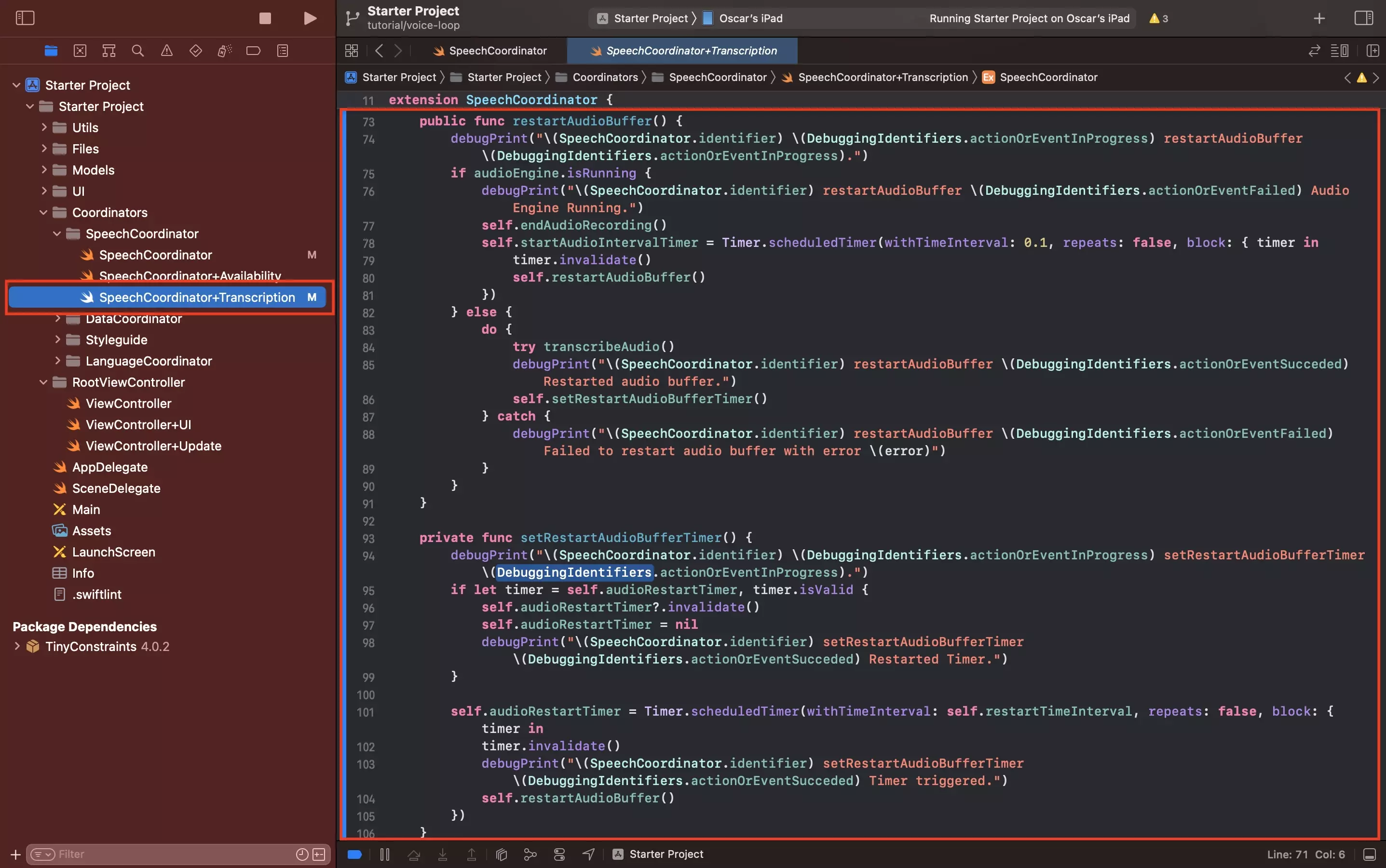 In SpeechCoordinator+Transcription.swift, add the restartAudioBuffer and setRestartAudioBufferTimer functions by pasting in the code below at the bottom of the extension.